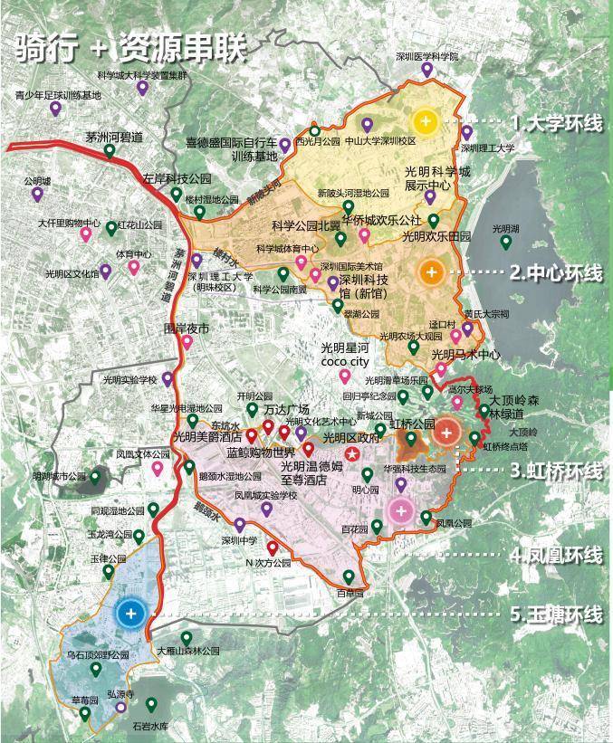 依托“山、水、城”交融的生态本底,光明区谋划打造总长125公里的骑行环线体系,其中,65公里的光明科学城大环线如同一条“绿链”,串联起光明区人文、科技、自然景观,尽览光明生态美景。为提升骑行体验,光明区精心设计10 条主题骑行路线,推出 “一街道一主题” 的特色线路,精准匹配不同人群需求。并积极联动虹桥希尔顿酒店、星河CoCocity、蓝鲸世界等各大商圈资源,大力发展“骑行友好酒店”,打造骑行主题商圈,带动“骑行+科研”“骑行+文旅”“骑行+赛事”“骑行+消费”融合生态发展,为市民游客奉上“骑行+”的多元骑行体验。